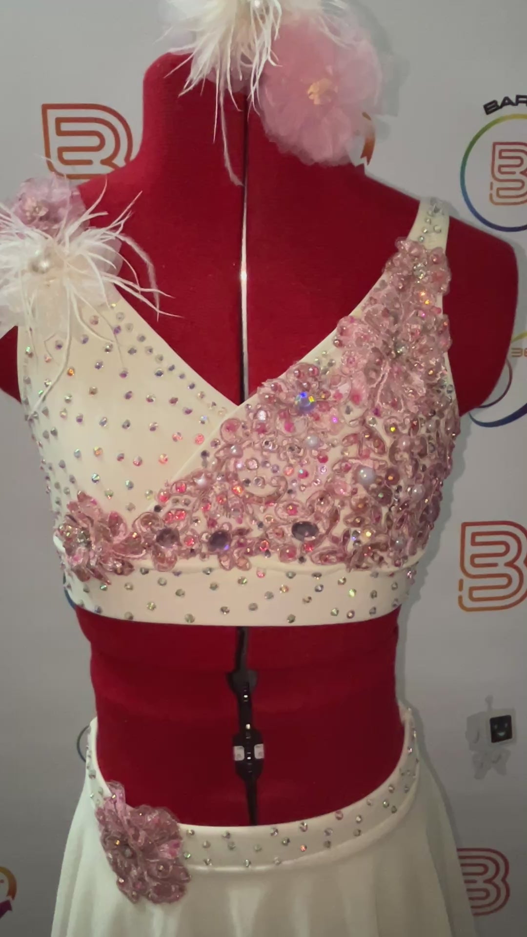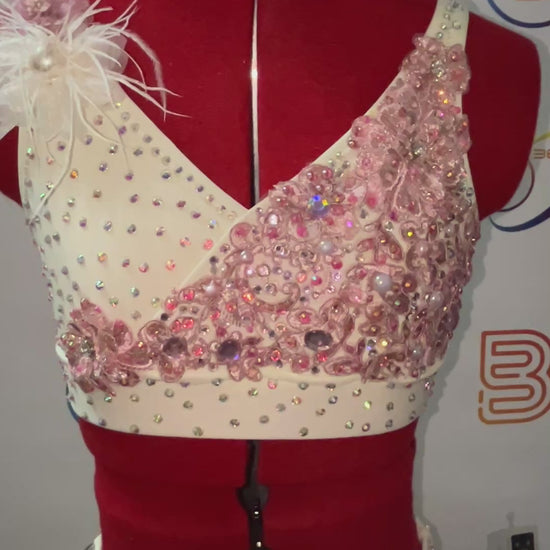 Graceful and enchanting, this two-piece lyrical dance costume combines ivory and soft pink tones for an ethereal stage presence. Delicate floral appliqués adorn the design, adding stylish detail and visual interest.